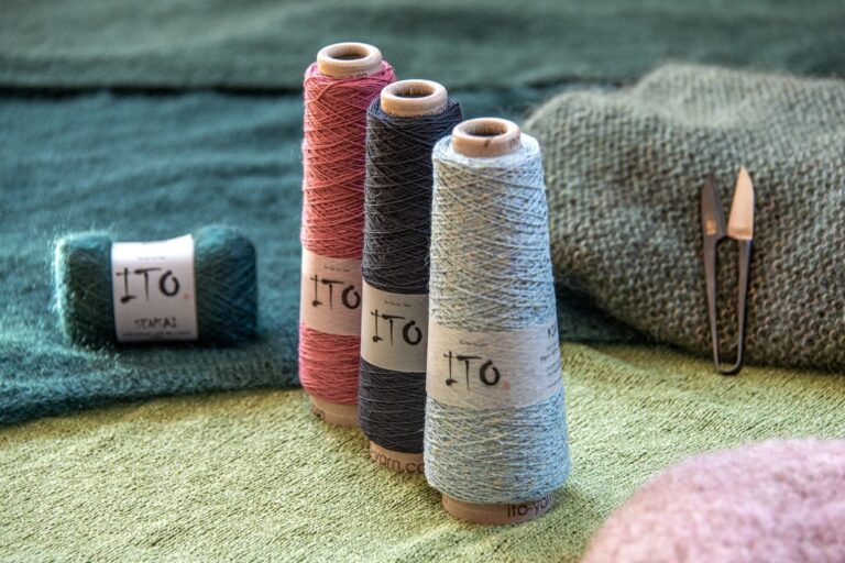 aus berlin kommen die in japan hergestellten ito garne. sie erhalten sensai, eine mohair-seide-mischung, kinu, die griffige bouretteseide, urugami mit einem papieranteil, das baumwollbändchen gima 8.5. und niji, ein sanft die farben wechselndes beilaufgarn.